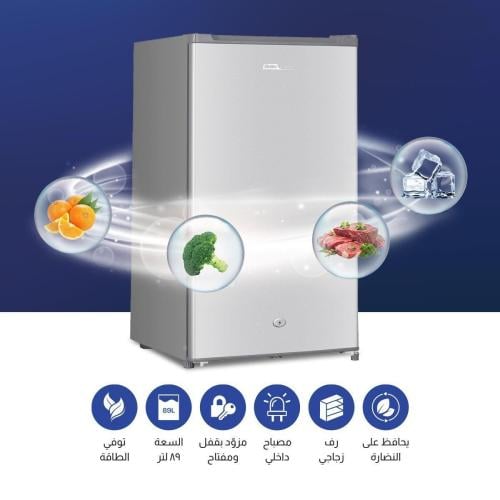 تمتع بتخزين مثالي للأطعمة والمشروبات مع ثلاجة الكترو جنرال ذات الباب الواحد بسعة 89 لتر وتصميم مدمج يناسب المساحات الصغيرة. مزودة بنظام إزالة الجليد يدويًا، رف زجاجي قابل للإزالة، وخزانة خضروات كريستالية مع غطاء زجاجي لحفظ الخضار طازجة. تصميم الباب الكريستالي مع شرفات للتخزين يضيف سهولة في التنظيم، وإضاءة LED أنيقة توفر رؤية واضحة.