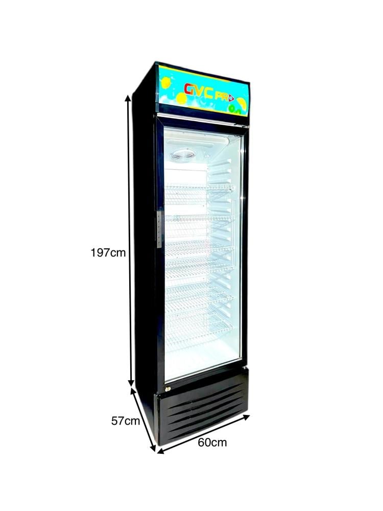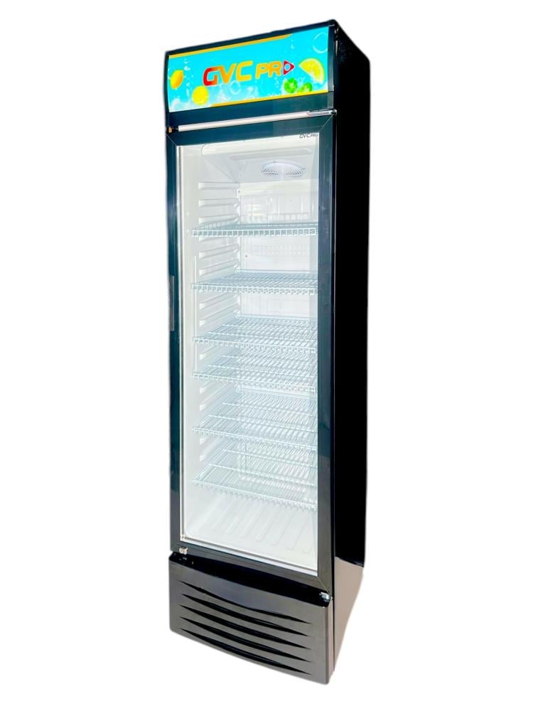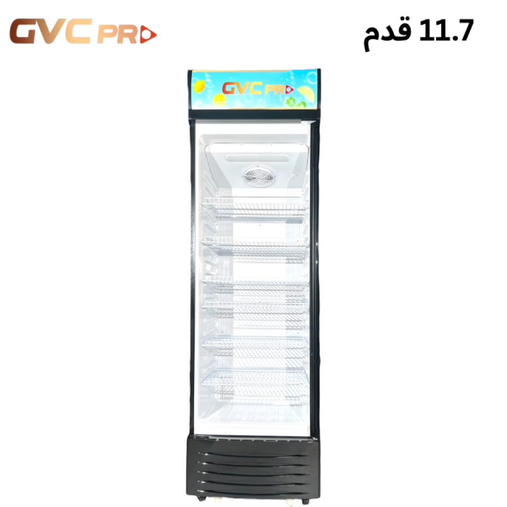 ثلاجة عرض من GVC PRO بسعة 338 لتر (11.9 قدم)، تمنحك تبريدًا سريعًا ومتوازنًا للمشروبات والمأكولات، بتصميم زجاجي أسود أنيق يعرض المنتجات بشكل جذاب.