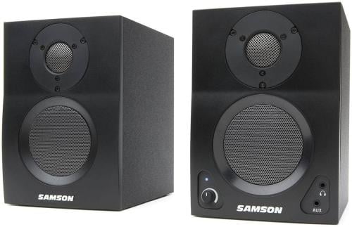 احصل على تجربة صوت احترافية في الاستوديو أو المكتب مع سماعات الاستديو النشطة سامسون MPT3 — تصميم ثنائي الاتجاه مع بلوتوث مدمج لتشغيل الصوت لاسلكيًا، وجودة ستيريو نقية مناسبة للموسيقى، المونتاج، البودكاست، وألعاب الكمبيوتر.